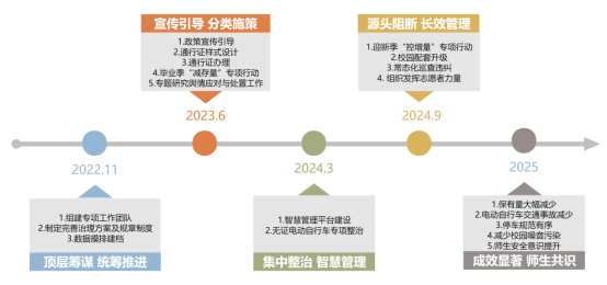 W大学X校区遵循“减少存量、严控增量、规范管理、循序渐进”原则,制定了分阶段治理方案。通过政策引导、技术赋能及多方协同,逐步实现校园电动自行车存量的有效控制与安全秩序的显著提升。