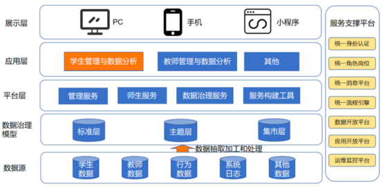 为确保数据的准确性和完整性,平台的设计中引入了多层次、全方位的数据治理模型。这一模型以统一的数据标准为基础,构建了清晰的主题层,使得平台能够高效、系统地汇集在校学生的多维数据,进而形成规范、可靠的数据源。