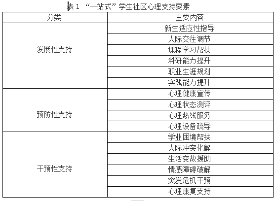 高校“一站式”学生社区心理支持的重要内容包含发展性、预防性和干预性三个方面,由大学生个体及与其接触的群体之间的交往及其活动构成。建设主体主要包括社区的朋辈队伍、辅导员及心理健康教育者。学生可以从社区支持体系中获得情感支持,即感受到被尊重和被理解的情绪体验,从而将“一站式”学生社区心理支持工作的重心从心理问题矫治转向构建以学生发展为导向的支持型建设。