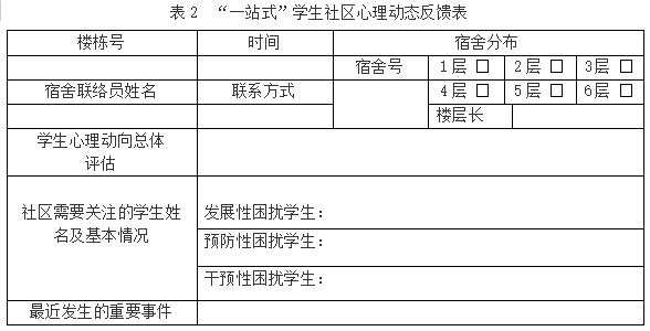 社区朋辈支持是社区支持体系中的重要组成部分,对安全稳定服务有着重要意义。朋辈之间通过“精准与普遍”结合方式,对学生奉献“爱心”,为“一站式”学生社区安全注入能量。主要包含两个方面的功能,一是宿舍同学的理解支持。宿舍同学作为危机同学最近距离的观察者,对学生个人情绪的调整至关重要。对情绪失控的学生要多加理解和关注并做好及时汇报。二是社区功能性党团支部中主要学生干部作用的发挥。以社区为单位,以楼层长负责制,对学生的心理问题开展周排查、月分析,实行重点帮扶和心理健康状况信息报告制度,做好日常追踪辅导和预防干预,如表2。同时积极带动学生参与集体活动,让学生感受到团体的阳光。