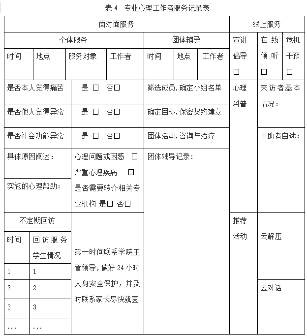 社区心理工作者从面对面服务和线上服务两个角度进行专业评估、教育引导及干预实施。如表4所示。对社区发展性困扰学生,进行谈心谈话、团体辅导,注重心理关怀。对于重点关注学生,做好防范措施,加大了解力度,做好跟踪回访。对于严重问题需要转介的学生采取措施实施相应的管理和治疗,具体处理过程包括健全家校沟通,将情况通知家长,进一步了解原生家庭的情况,建议家长陪同学生进行正规医院进行检查诊断,康复后再返回校园学习和生活。同时,还可以通过线上平台提供规范的宣教倡导、在线倾听、情绪疏导与支持、危机干预等心理援助服务。