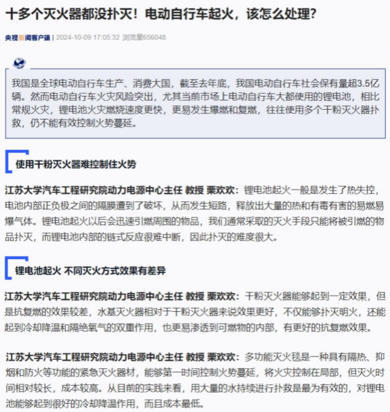 2024年10月9日,《央视新闻》及其客户端刊发《十多个灭火器都没扑灭!电动自行车起火,该怎么处理?》