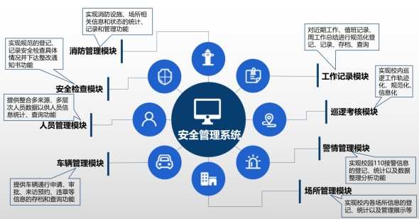 以定制开发的安全管理信息系统为数据中心,对接学校网信办数据中心获取在职教职工、在校学生相关个人信息,对接学生处宿舍管理系统宿舍人员分布、学生公寓出入等信息,并与海康高校安全管理平台深度对接,获取校内视频监控、校内从业人员及家属相关信息、人员车辆出入及行为轨迹等数据,结合校园安全管理工作需要对数据进行融合处理,衍生出八个与实际工作紧密相关的功能模块,实现了校园安防数据使用管理的智能化、集成化,并通过手机APP等移动终端实现了安全工作的移动化管理。