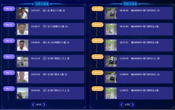 通过布设人脸抓拍摄像机、结构化摄像机等实现人员、车辆在校园内活动的管控。前端人脸抓拍设备抓拍到清晰的人脸照片后通过超脑设备与人脸库照片进行比对,与各门口人员通过人脸识别门禁设备生成的出入记录一同形成了人员从入校到出校整个过程完整的轨迹。结构化抓拍设备可对抓拍到的车辆号牌进行识别,与各门口车辆通过车辆道闸设备生成的出入记录及道路卡口摄像机抓拍的车辆通过信息共同形成了车辆完整的行驶轨迹。