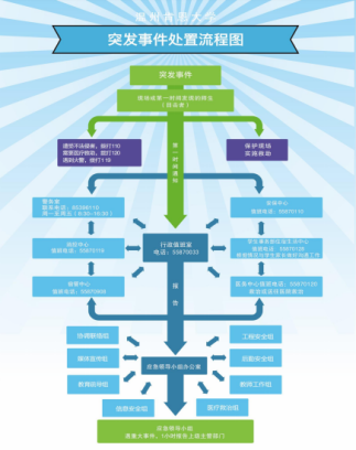 学校成立突发事件应急处置工作应急领导小组和8个工作小组,全面负责学校应对突发事件的处置工作,形成以校级应急领导小组为核心的处置突发事件快速反应机制。一旦发生重大事件,确保发现、报告、指挥、处置等环节的紧密衔接,做到快速反应,正确应对,处置果断,力争把问题解决在萌芽状态。