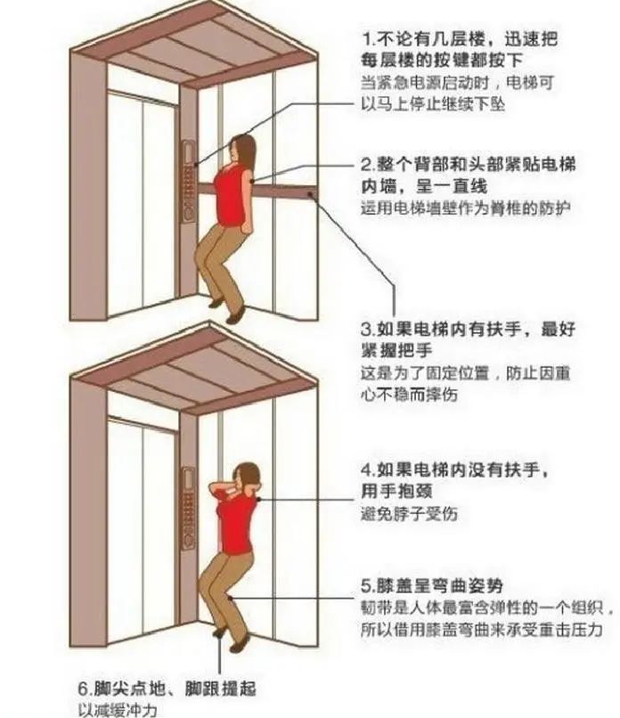 2.自我保护:将整个背部和头部紧贴梯箱内壁,用电梯壁来保护脊椎。同时下肢呈弯曲状,脚尖点地、脚跟提起以减缓冲力。用手抱颈,避免脖子受伤。